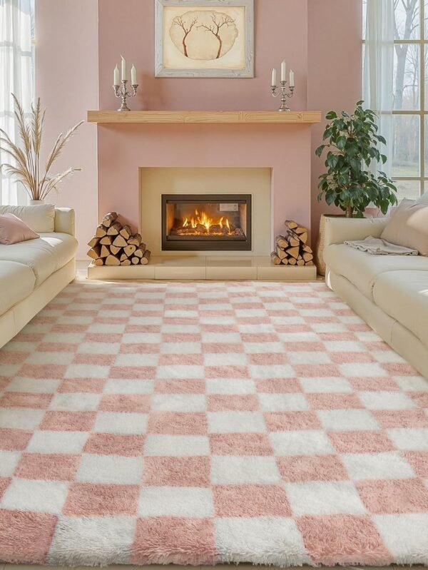 Checkered Rug 8x10 for Living Room, Pink and White Modern Shag Rug Washable Non-Slip Large Area Rug Super Soft Indoor Fuzzy Carpet Fluffy Rugs for Bedroom Home Aesthetic Decor