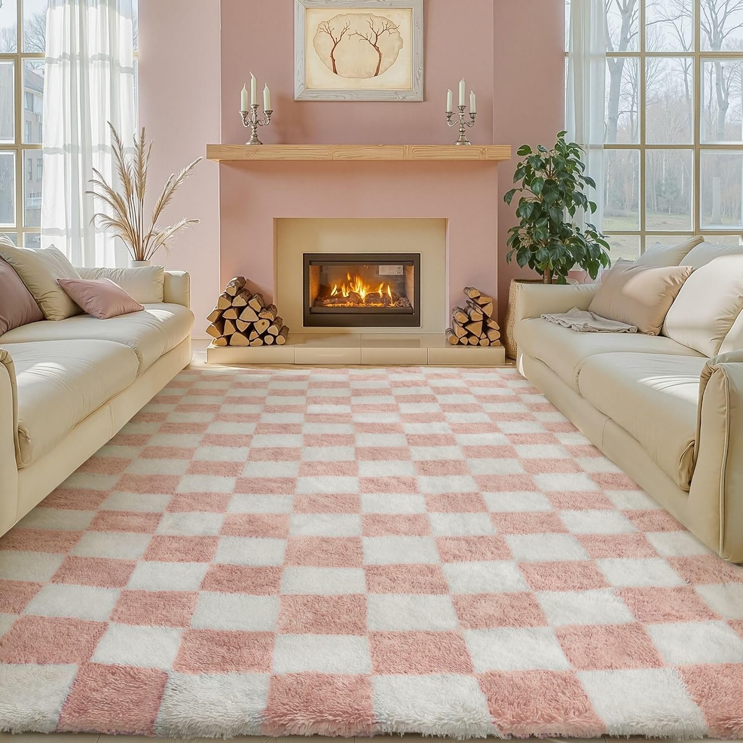 Checkered Rug 8×10 for Living Room, Pink and White Modern Shag Rug Washable Non-Slip Large Area Rug Super Soft Indoor Fuzzy Carpet Fluffy Rugs for Bedroom Home Aesthetic Decor