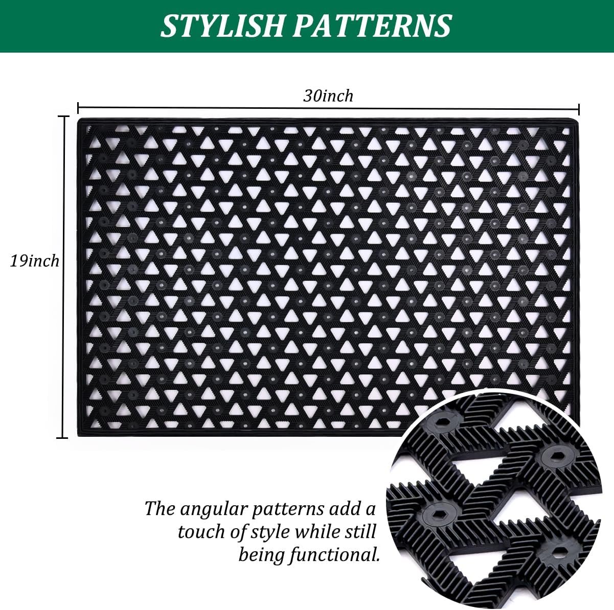 - EASY TO CLEAN INDOOR OUTDOOR RUBBER MAT: Drainage mat Designed with more than 150 drainage holes, entryway mat with an open triangle drainage structure. The thickness allows water to drain and not pool. easy to clean A quick rinse with a hose, and it’s good to go. The drainage holes help it dry quickly. Don’t worry about mold.