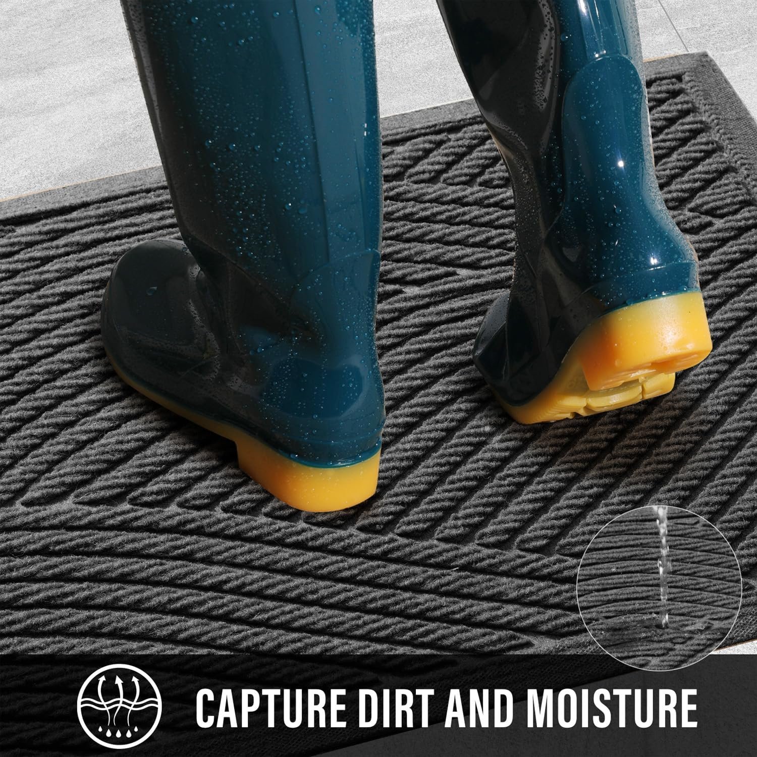 • Capture Dirt and Moisture: Doormat super absorbent, outdoor welcome mat holds up to 1.8 gallons of water per square yard. Deep groove design and rubber border helps capture water and prevents excess water from spilling onto the ground. Indoor door mat surface fibers scrape dust and debris from your shoes, boots, paws. Let the dirt stay out